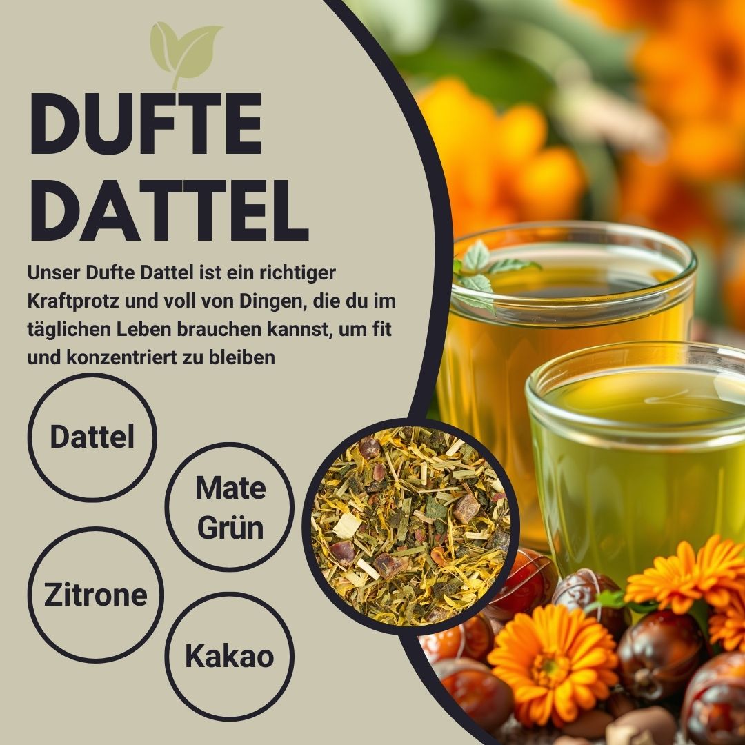Neben Datteln enthält unser Tee eine sorgfältig ausgewählte Mischung aus Lemongras, grünem Sencha-Tee aus China, Brennnessel (11%), grünem Mate, natürlichem Aroma, Ringelblumen, Kakaoschalen (4%) und Zitronenschalen. Diese Kombination sorgt nicht nur für einen ausgewogenen, frischen Geschmack, sondern auch für ein belebendes und wohltuendes Trinkerlebnis.