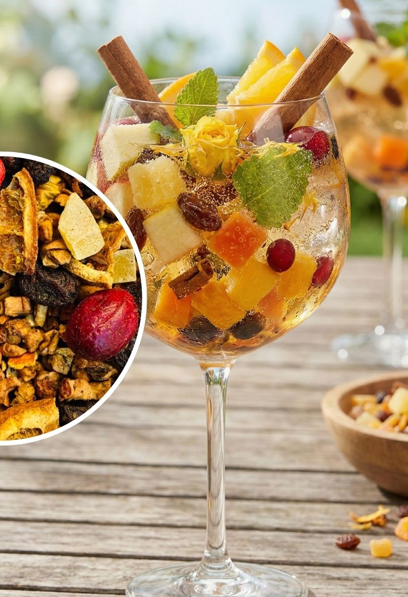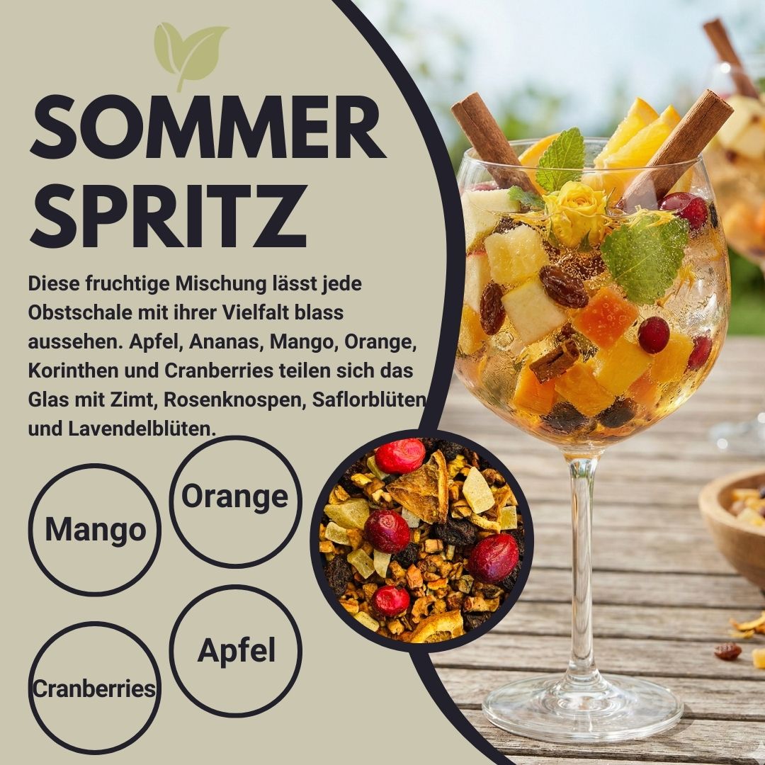 Unser Sommer Spritz hält was er verspricht! Diese fruchtige Mischung lässt jede Obstschale mit ihrer Vielfalt blass aussehen. Apfel, Ananas, Mango, Orange, Korinthen und Cranberries teilen sich das Glas mit Zimt, Rosenknospen, Saflorblüten und Lavendelblüten. Der betörend intensive Duft nach Sommer, Urlaub und Eis am Strand verwandelt sich nach der Zubereitung des Eistees in eine dezentere, sanftere Note und lässt so Platz für die Ergänzung eines Fruchtsirups, der Ihrer Erfrischung zusätzliche Süße verleiht. Der fertig zubereitete Eistee ist erfrischend und leicht. Anders als die Eistees aus dem Supermarkt, sehen Sie bei unseren Varianten genau, was Ihnen ins Glas kommt. Sie selbst entscheiden über den richtigen Grad an Süße und nicht zu vergessen die Individualität ihres Getränkes, das sie aus unseren unverwechselbaren Teesorten und den zahlreichen Fruchtsirups selbst zusammenstellen können.